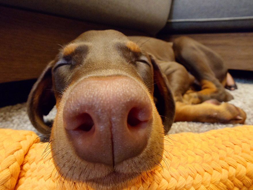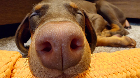 おもちゃの上で爆睡中のドーベルマンパピーです。