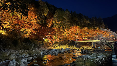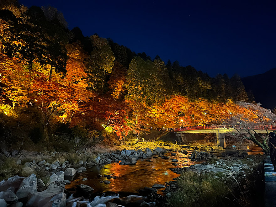 夏の暑さが和らぎ、朝と夕に肌寒さを感じ始める頃、私はこの景色を思い出し心が躍ります。毎年11月ごろ愛知県にある香嵐渓では紅葉の紅葉がライトアップされ、そこには幻想的な世界が広がっています。ここへ足を運ぶと異世界へ来たかのような気持ちになり、心が癒されます。