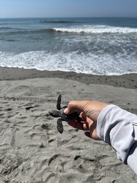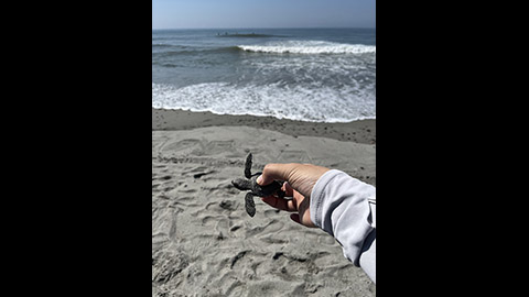 海ガメ放流会の子カメさんです。数分間の出会いでしたが、愛着が湧き、これから20年以上に亘る太平洋の大冒険に出ると思うと、心配で涙が出そうになりました…
