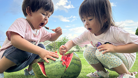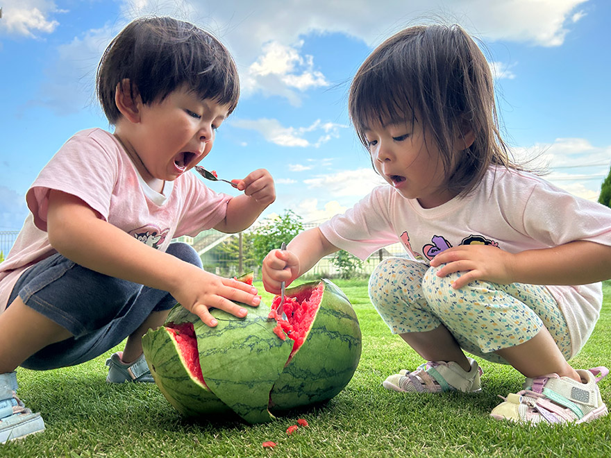 庭ですいか割りをして、そのままスプーンで。ちょっとしたことを、とても愛おしい時間にしてくれる子どもたち。