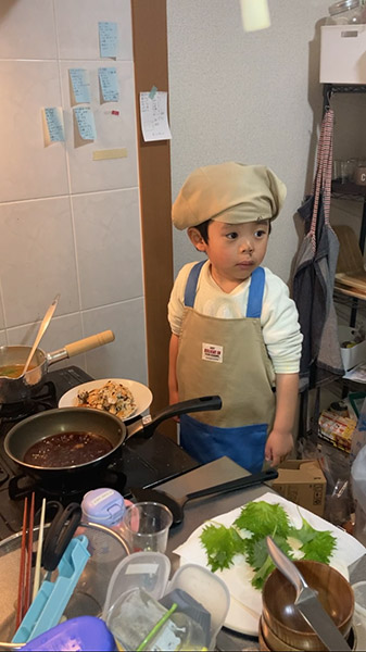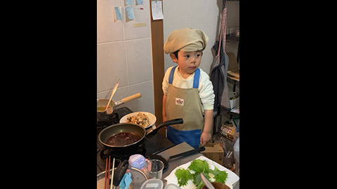 料理をしたい園児の息子の写真です。火への注意を教えたり、踏み台を用意したり、、普段の何気ない調理工程を、一つ一つ勉強していく息子から、基本の大切さを気付かされました。