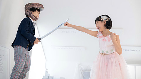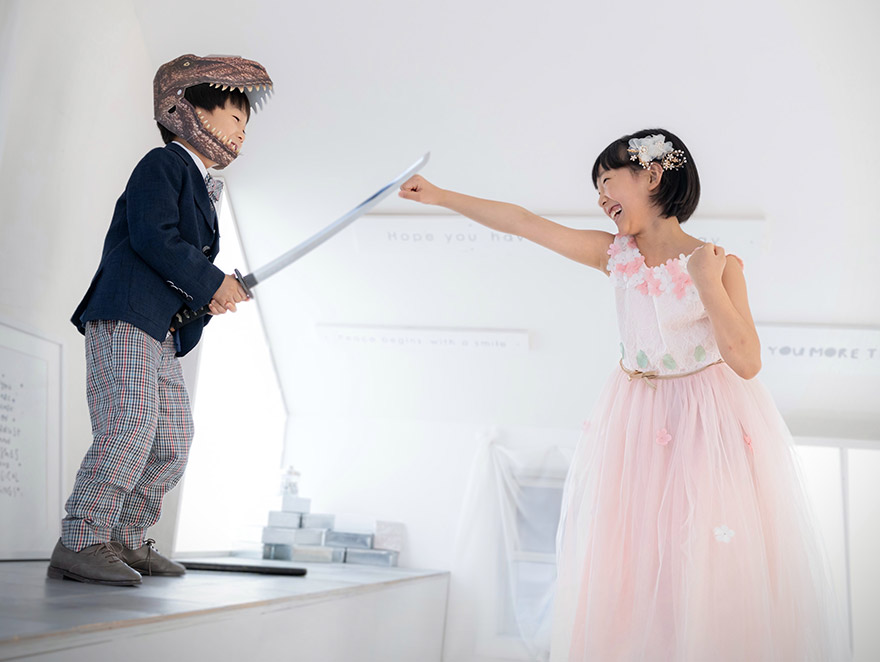 我が家の恐竜とお姫様です。753の写真撮影のオフショット。恐竜の被り物は、ツーリズムEXPOジャパンでもらって、ずっと被ってます笑