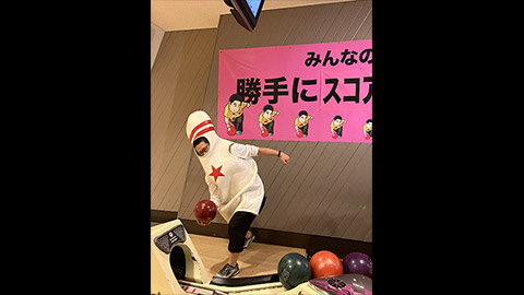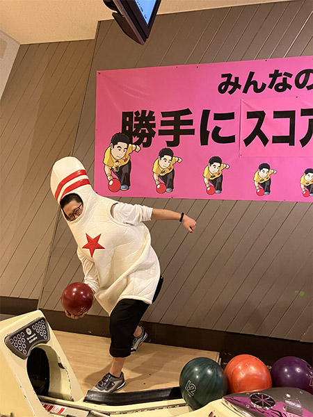 「グループで点数が低かった人が、ボーリングのピンの着ぐるみを着ようぜ」と本人から言い出し、案の定ご自身が最下位になる、100点満点のストーリー(笑)。