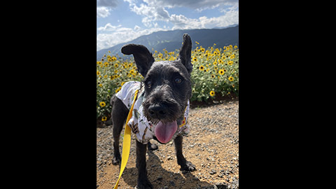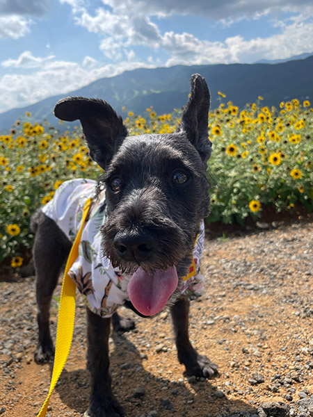 今年8歳になった愛犬ミニチュアシュナウザーのレオくんと、夏にひるがのピクニックガーデンへ行った時の写真です。アロハシャツを着て黄色いお花とも良く似合う、とっても可愛い我が家のアイドルです。これからもたくさんいろんな場所へ一緒に行けるといいな。
