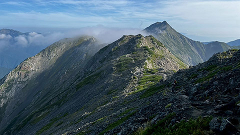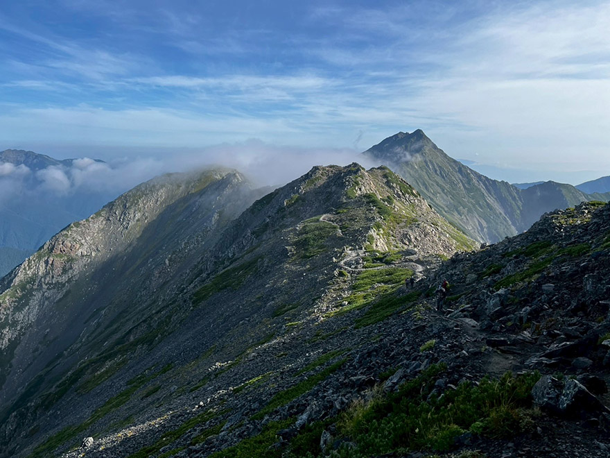 8月に休暇を取って家族3人で白根三山を縦走してきました。間ノ岳から北岳を望んだ風景(天空の縦走路)