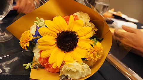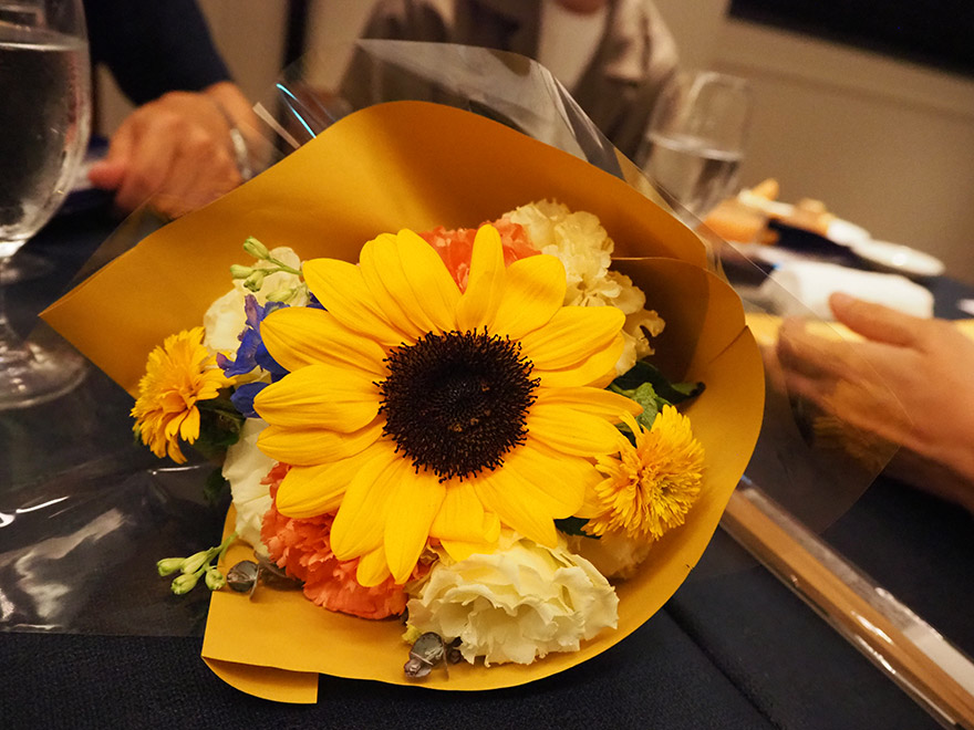 両親の銀婚祝いでフレンチに行った時の写真です。写真に写っているのは弟と用意した花束と記念品(名入り箸)、背景には父、弟、母の手元が写っています。私たちを産んでくれた大好きな両親をお祝いする素敵な時間であるとともに、当時入社前に大阪で学生をしていた私、東京で学生をしていた弟が参加することで家族全員が揃う滅多にない機会でした。銀婚祝いができるほどの両親の円満な関係性と、両親の銀婚祝いをしたいという子どもたちの願いがあったからこそ叶った場だと思います。ちなみに、花束は子どもたちから以外に、父が用意したものもあり、しばらくの間自宅が花の香りに包まれていました。