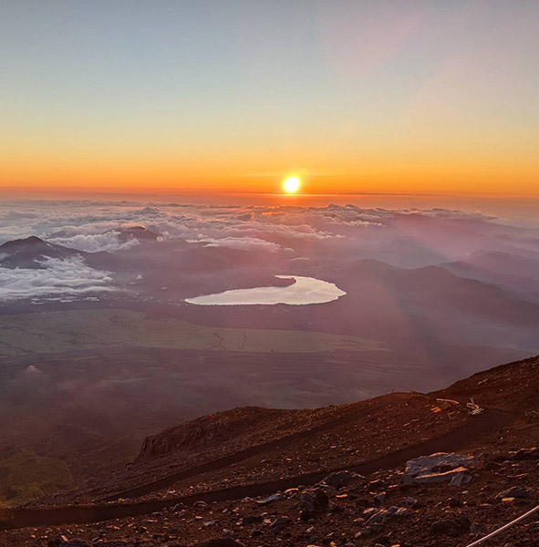 3度目の富士山登頂にトライ。 今年はルートを変えて、吉田ルートに初挑戦。登頂中はしんどいですが、この風景を見ることが楽しみで頑張ります。この日はお天気が良く 山中湖と雲海とご来光に癒されました。