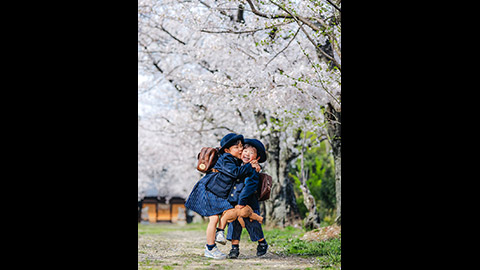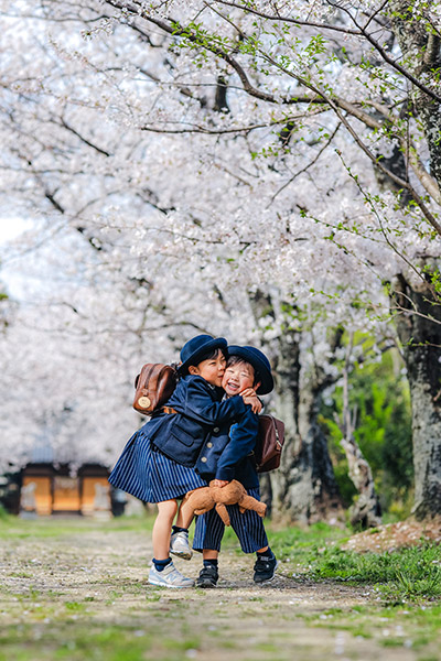 桜の下で寄り添う二人の笑顔がとても素敵です。見ているだけで心があたたかくなります。